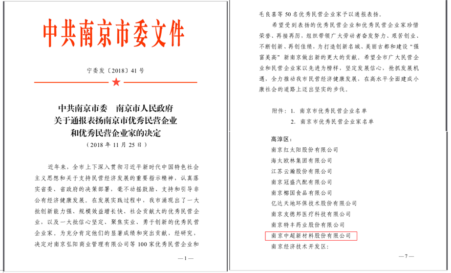 熱烈祝賀南京中超新材料股份有限公司榮獲南京市優(yōu)秀民營企業(yè)稱號 2018-12-14